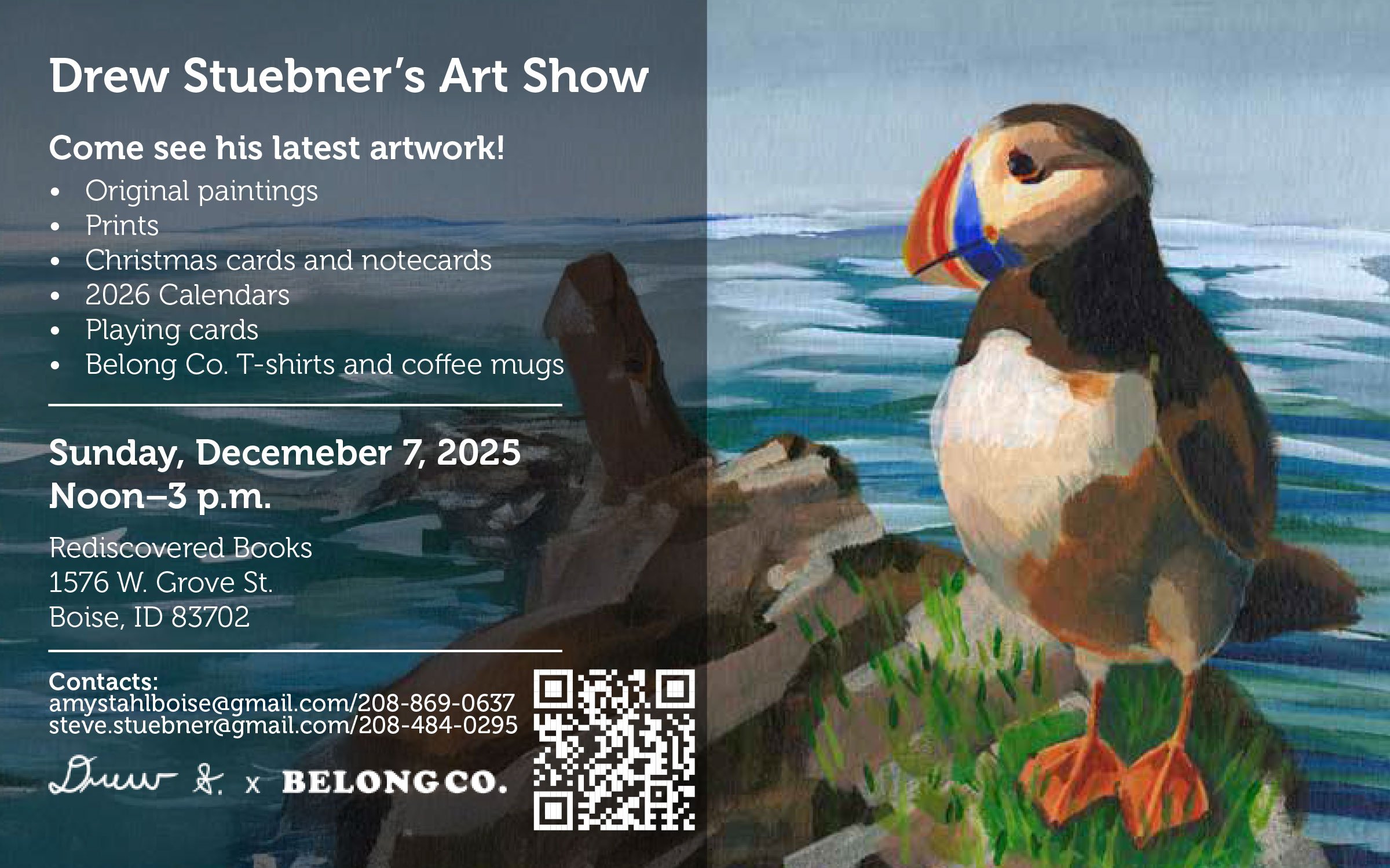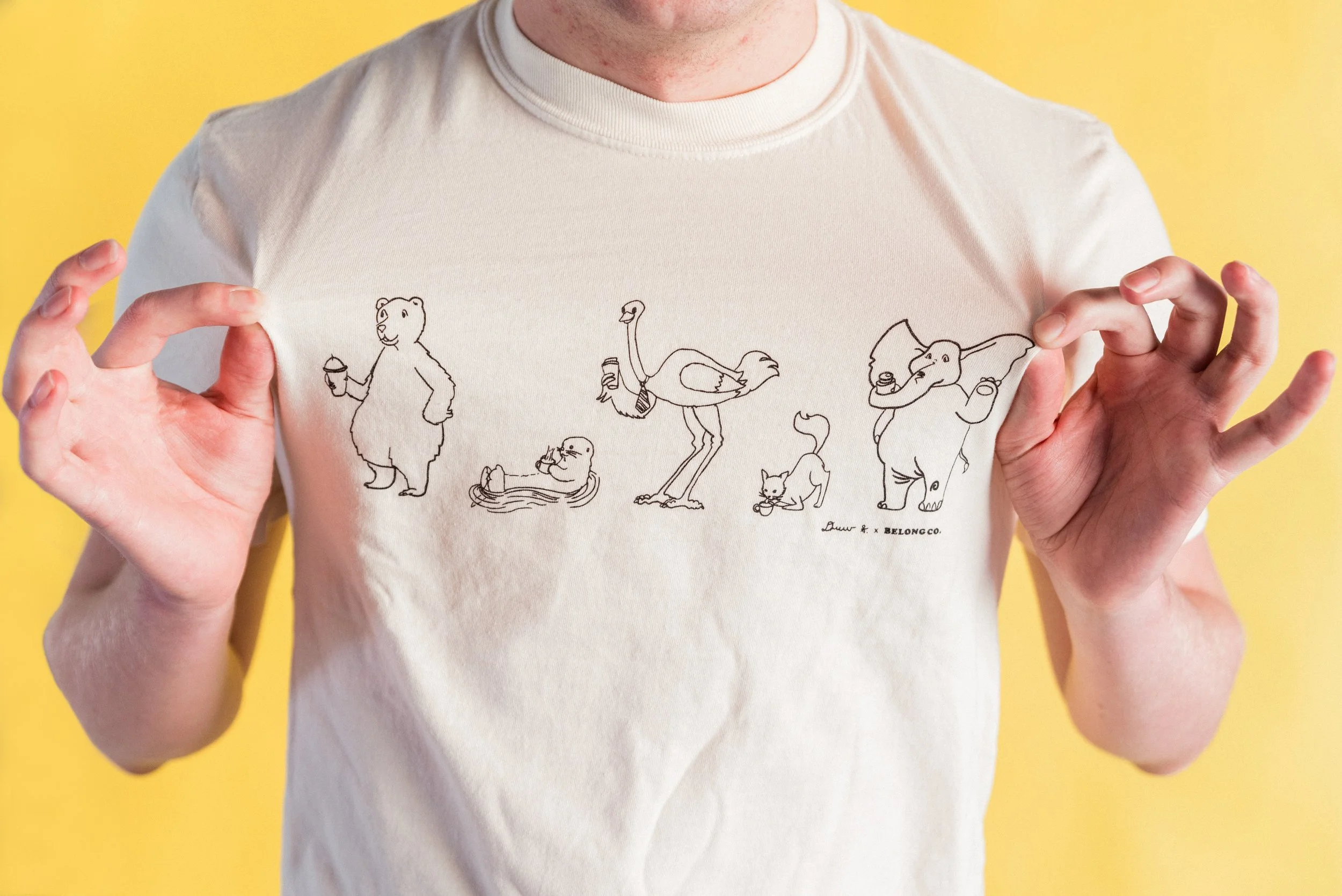 T-shirts featuring custom artwork that Drew created for the Belong Co., a Boise nonprofit that creates job opportunities for adults with disabilities, including Drew!