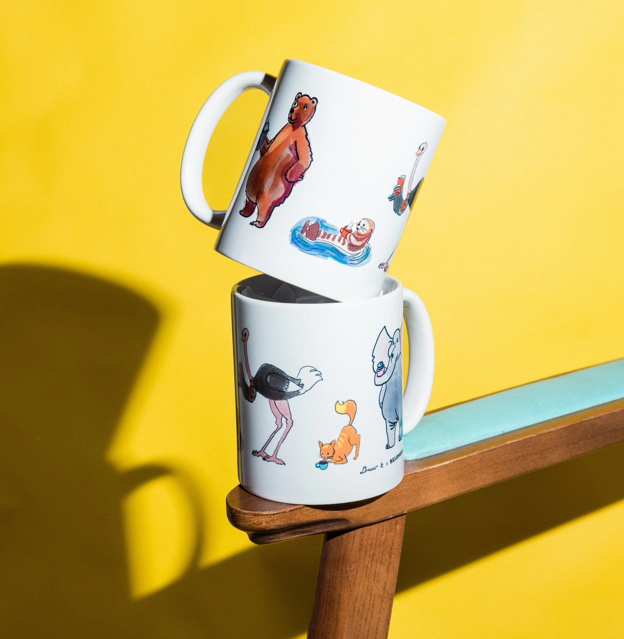 Drew custom coffee mugs - animals he created for Belong Co., a Boise nonprofit, for their coffee cart business.